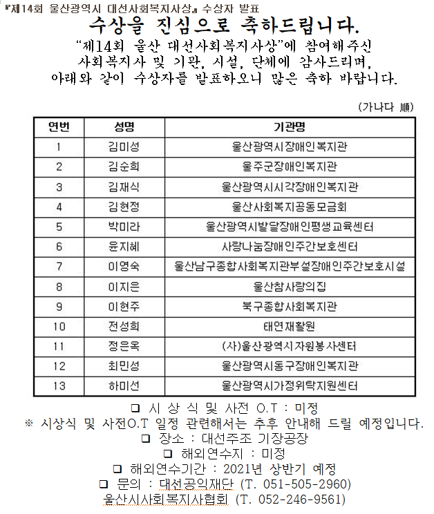 『제14회 울산광역시 대선사회복지사상』수상자 발표