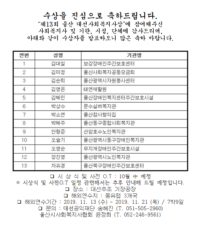 2019년『제13회 울산 대선사회복지사상』수상자 발표