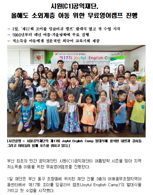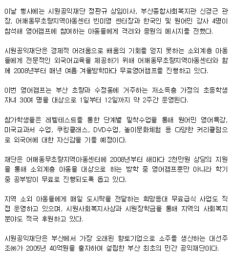 시원공익재단, 여름방학 무료영어캠프 개최