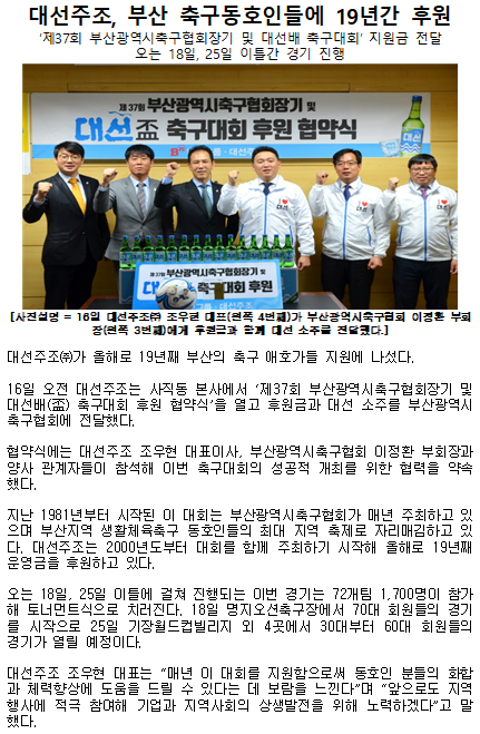 대선주조, 부산 축구동호인들에 19년간 후원