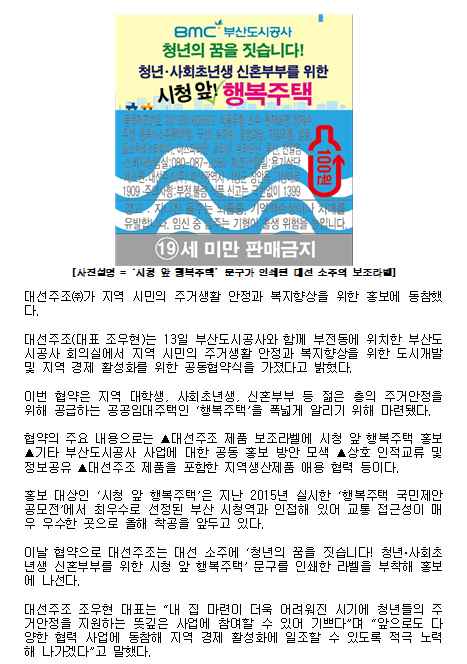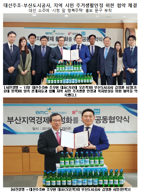 대선주조-부산도시공사, 지역 시민 주거생활안정 위한 협약 체결