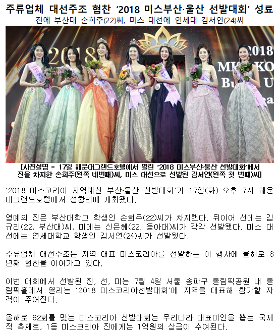 주류업체 대선주조 협찬 ‘2018 미스부산.울산 선발대회’ 성료