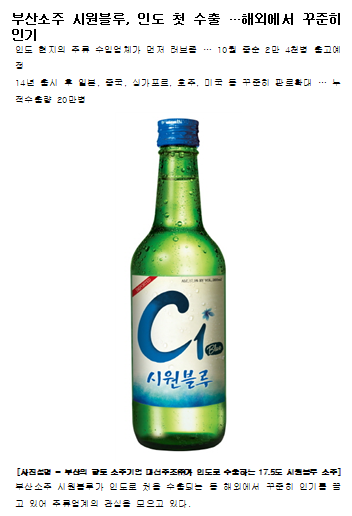 부산소주 시원블루, 인도 첫 수출