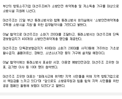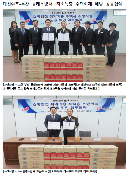 대선주조-부산 동래소방서, 저소득층 주택화재 예방 공동협약