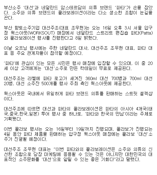 부산 향토소주기업 대선주조㈜, 네덜란드 편집샵 ‘파타’와 콜라보
