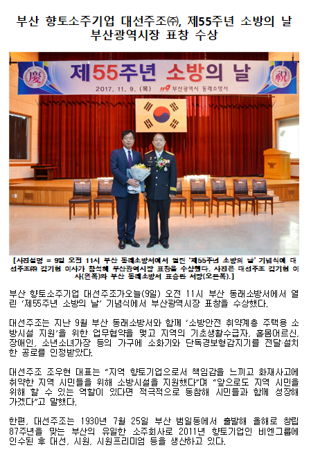 부산 향토소주기업 대선주조㈜, 제55주년 소방의 날 부산광역시장 표창 수상