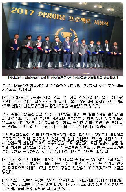 대선주조, 대학생이 뽑은 일하기 좋은 기업 선정