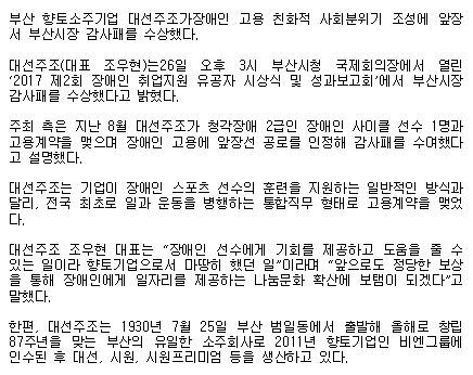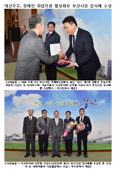 대선주조, 장애인 취업지원 활성화로 부산시장 감사패 수상