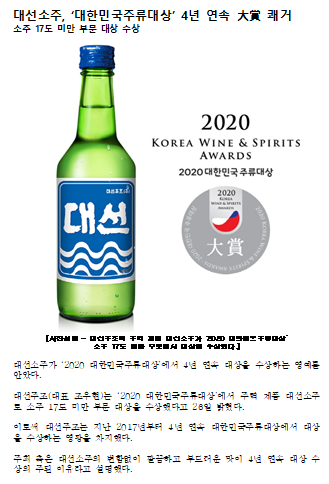 대선소주, ‘대한민국주류대상’ 4년 연속 大賞 쾌거