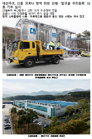 대선주조, 신종 코로나 방역 위한 선행...'알코올 주조원료' 32톤 기부 실시
