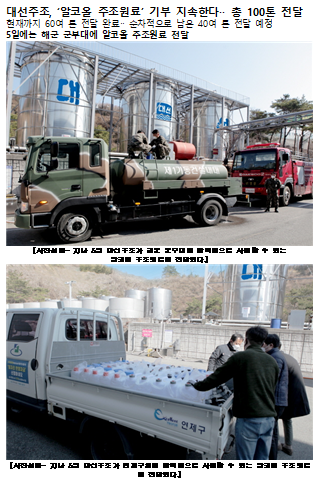 대선주조, 신종 코로나 방역 위한 선행...'알코올 주조원료' 32톤 기부 실시