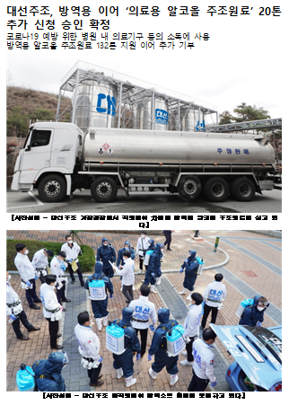 대선주조, 방역용 이어 '의료용 알코올 주조원료' 20톤 추가 신청 승인 확정