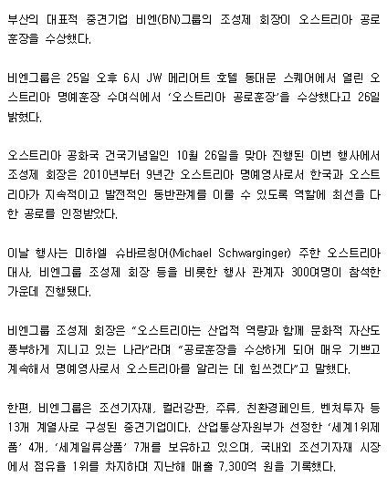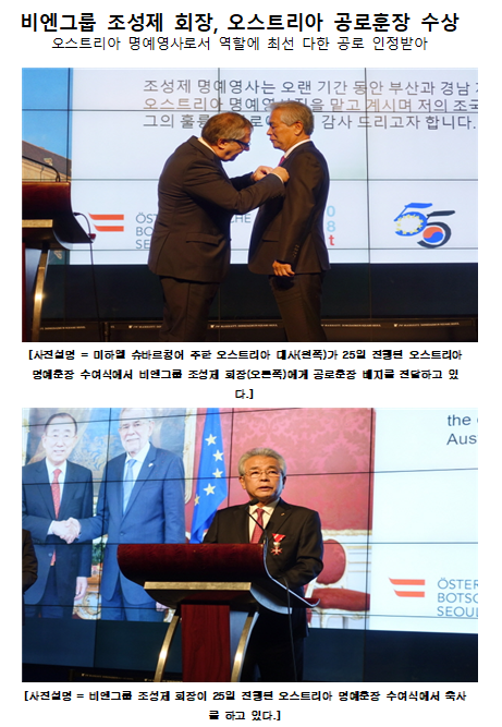 비엔그룹 조성제 회장, 오스트리아 공로훈장 수상